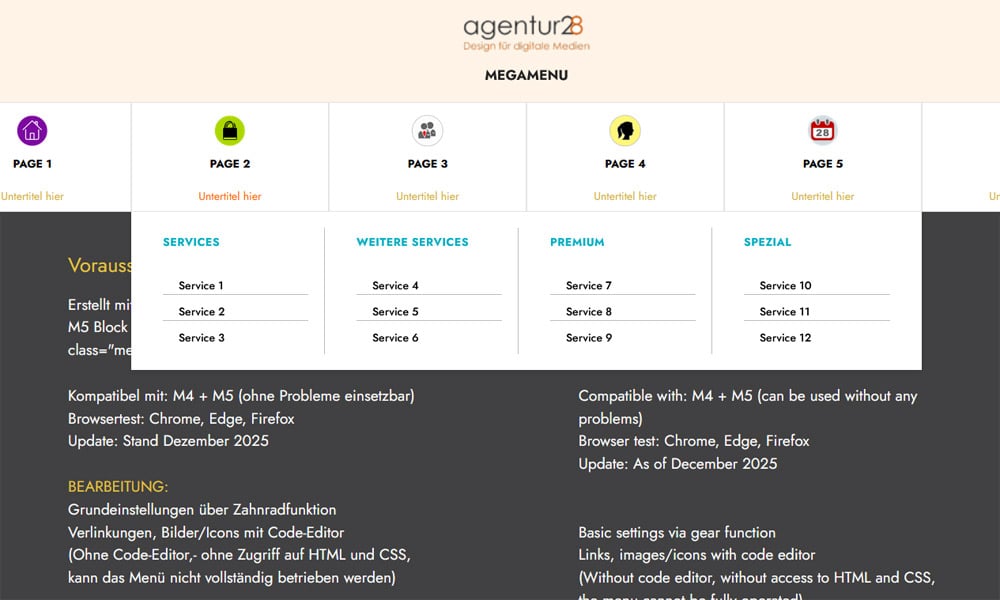 Das Sekundärmenü kann 1-4 Spalten mit einer zugewiesenen Überschrift enthalten.